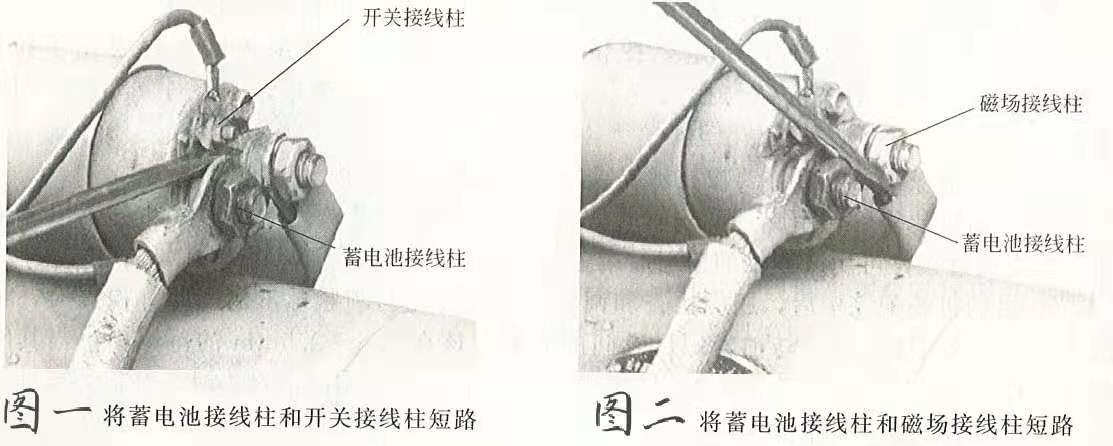 6.用旋具再將蓄電池接線柱和磁場接線柱短路。若啟動機正常運轉,則說明電磁開關內(nèi)部有故障,應拆下電磁開關,檢查電磁開關內(nèi)部的活動觸頭和兩個靜觸頭的燒損情況及磁力線圈是否燒損等。如啟動機仍不運轉,且在短路時無火花出現(xiàn),則說明啟動機內(nèi)部出現(xiàn)斷路故障;若火花出現(xiàn),則說明啟動機內(nèi)部出現(xiàn)短路現(xiàn)象,應將啟動機拆下后進行修理。