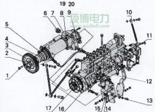 1.噴油泵正時(shí)齒輪緊固螺栓 2噴油泵齒輪墊板 3噴油泵齒輪 4噴油泵傳動(dòng)軸 5傳動(dòng)軸套與齒輪室蓋板聯(lián)接螺栓 6調(diào)整螺套 7噴油泵傳動(dòng)軸套 8油泵聯(lián)接 螺栓 9傳動(dòng)軸套與機(jī)體聯(lián)接螺栓 10增壓補(bǔ)償管 11油門開關(guān)總成 12燃油切斷裝置 13油泵托架螺栓 14油泵托架 15噴油泵油管接頭 16噴油泵連接盤 17油泵外花鍵