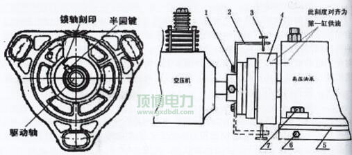 1.YC6105ZLQ機(jī)型,不管用P型泵或VE泵,都是通過連接板用兩件螺栓直接與空壓機(jī)轉(zhuǎn)動(dòng)軸連接的。先把油泵托架上的油泵緊固螺栓上緊,后再把與空壓機(jī)連接的螺栓緊固即可。注意:此時(shí)必須保證油泵第一缸處于供油時(shí)刻。如圖 2-9-1和圖2-9-3。 油泵與空壓機(jī)轉(zhuǎn)動(dòng)軸(或油泵連接軸)的同軸度一般控制在0.4mm以下。