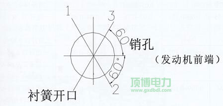 注:1、對大頭切口為平口的連桿安裝時不分向前向后(YC4110機)2、對YC6112、YC4112機斜切口連桿安裝適用于圖B,其余適用于圖AYC4110、YC4112、YC6105、YC6112、YC6113機型適用 注:1、2、3為環(huán)的開口位置圖2-5-11 活塞環(huán)開口安裝位置圖
